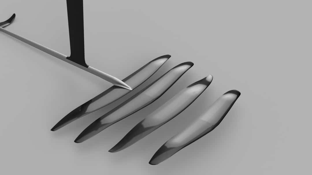 F4 has been developing hydrofoils for windsurf boards over the last year and recently went into production. The new windsurf foil is based on carbon prepreg construction and is very stiff and strong. This new hydrofoil is allowing riders a new level of performance and stability enabling upwind and downwind performance comparable with formula windsurf boards. Flying above the water allows for a consistent speed since the motion through the water is not significantly affected by the waves and chop. The ride is particulary smooth and enjoyable. Riders can use much smaller sails, in the 5 to 7M range, compared with formula boards.